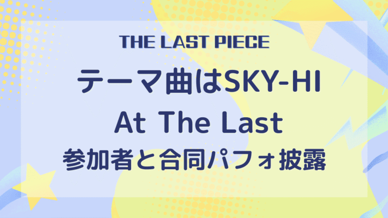 BMSGオーディションTHE LAST PIECEのテーマ曲はSKY-HI「At The Last」。そして合宿審査のラストを飾るのは、SKY-HIと最終審査メンバーでのパフォーマンスとなります。(9...